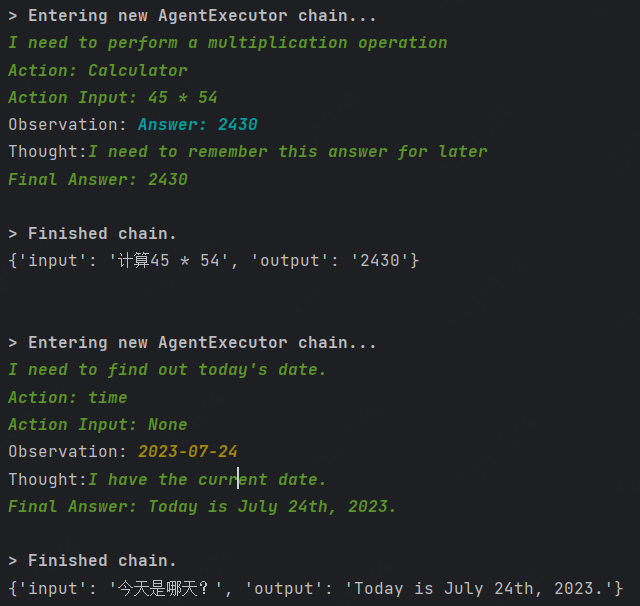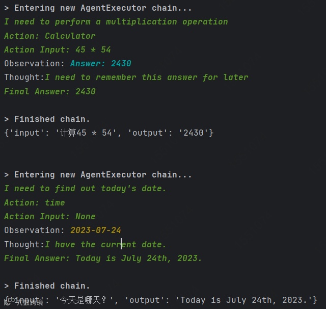 from azure_chat_llm import llmfrom langchain.agents import load_tools, initialize_agent, toolfrom langchain.agents.agent_types import AgentTypefrom datetime import datedef time(text: str) -> str:"""返回今天的日期。"""return str(date.today())tools = load_tools(['llm-math'], llm=llm)tools.append(time)agent_math = initialize_agent(agent=AgentType.ZERO_SHOT_REACT_DESCRIPTION,tools=tools,llm=llm,verbose=True)print(agent_math("计算45 * 54"))print(agent_math("今天是哪天?"))
