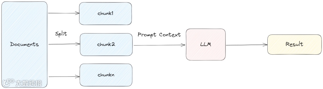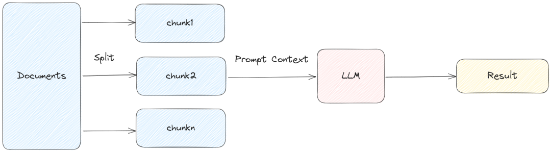 这种方式可以完整的保留上下文,调用LLM的次数也比较少,建议能使用stuff的就使用这种方式。其适合文档拆分的比较小,一次获取文档比较少的场景,不然容易超过token的限制。
