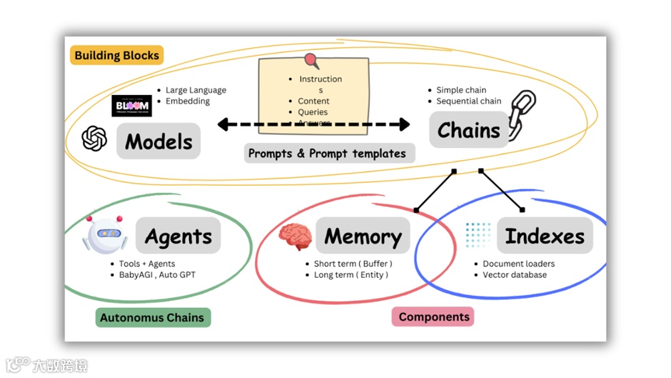 LangChain提供了各种不同的组件帮助使用LLM,如下图所示,核心组件有Models、Indexes、Chains、Memory以及Agent。