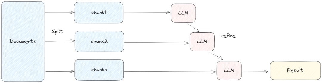 RefineDocumentsChain是通过迭代更新的方式获取答案。先处理第一个文档,作为context传递给llm,获取中间结果intermediate answer。然后将第一个文档的中间结果以及第二个文档发给llm进行处理,后续的文档类似处理。