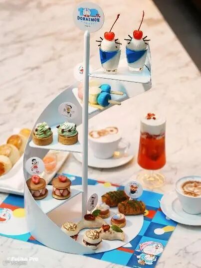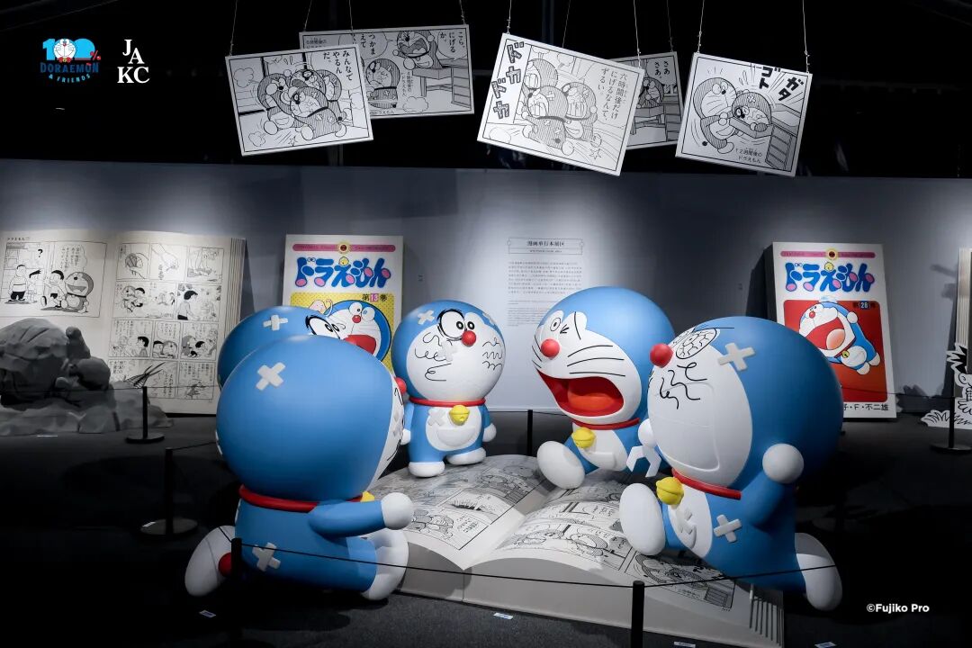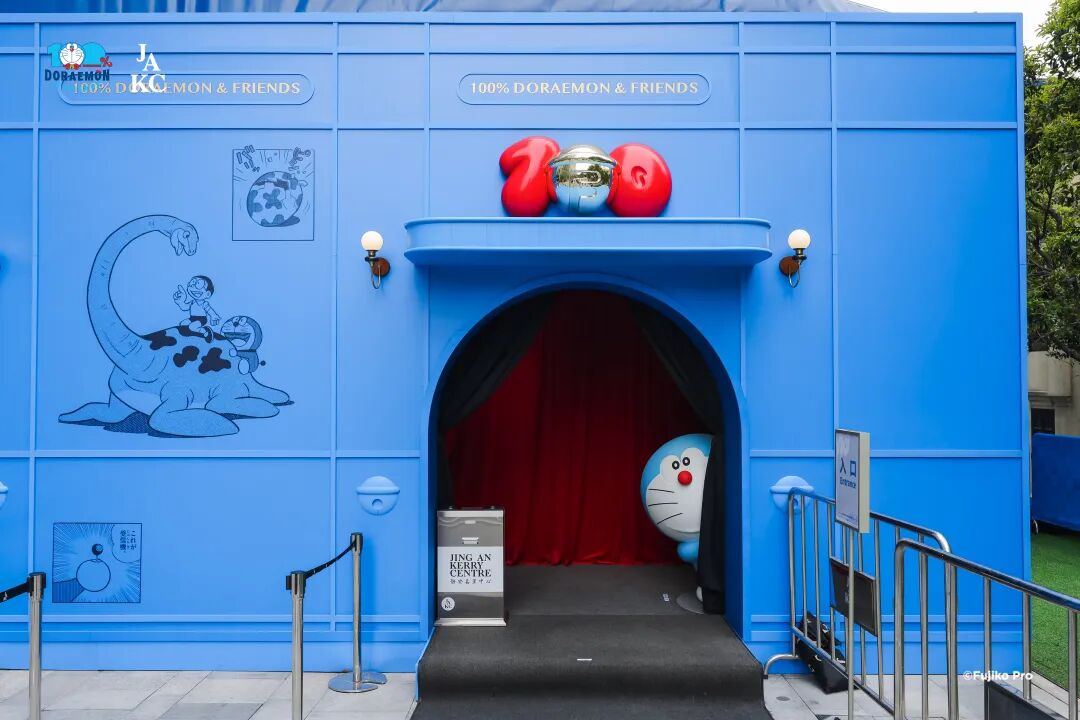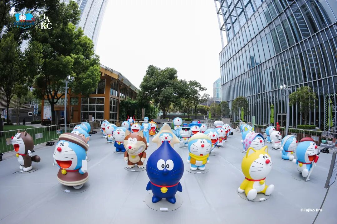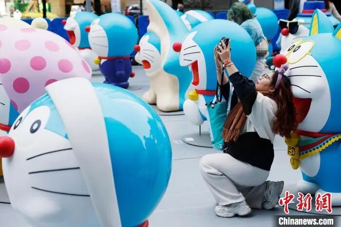 ドラえもんと記念写真を撮影する来場者(4月1日撮影・殷立勤)。