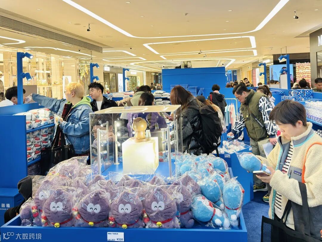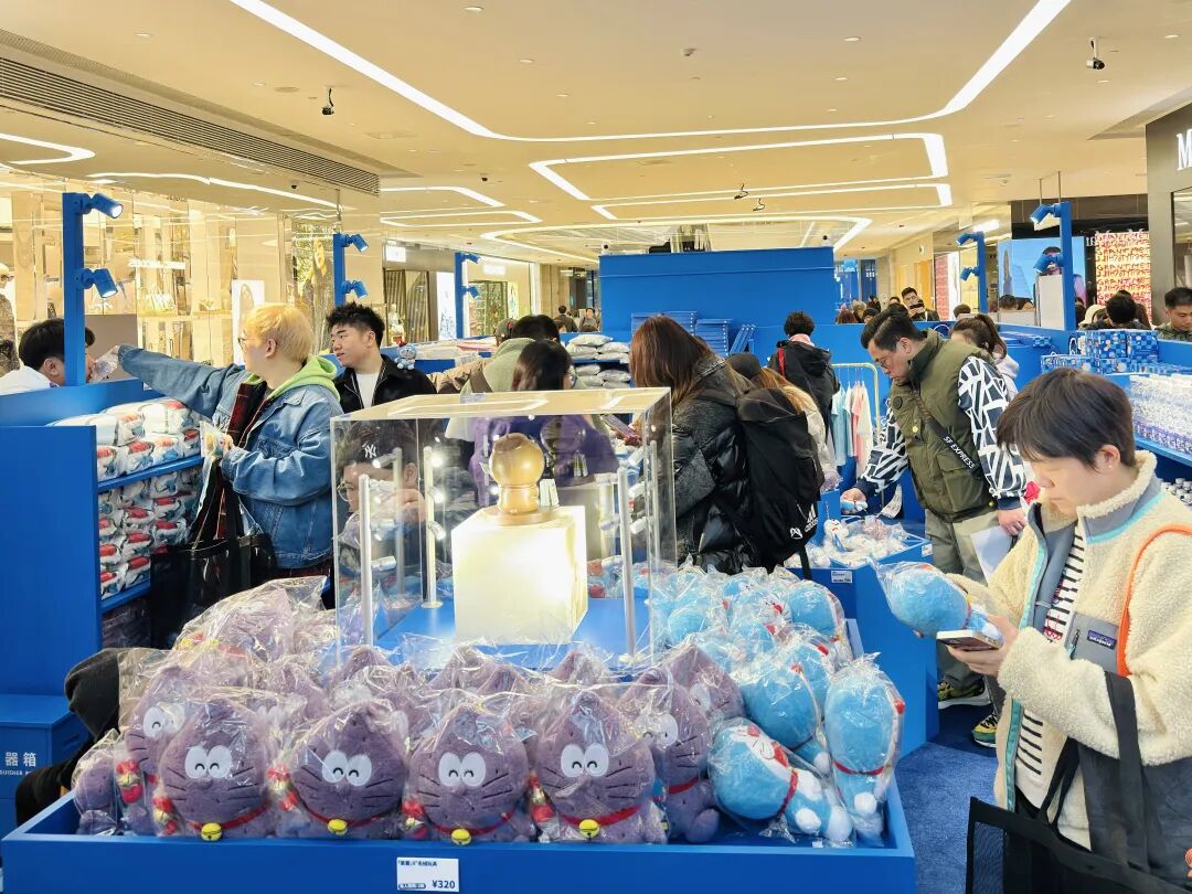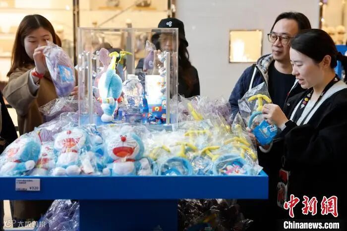 ドラえもんの公式グッズを選ぶ来場者(4月1日撮影・殷立勤)。