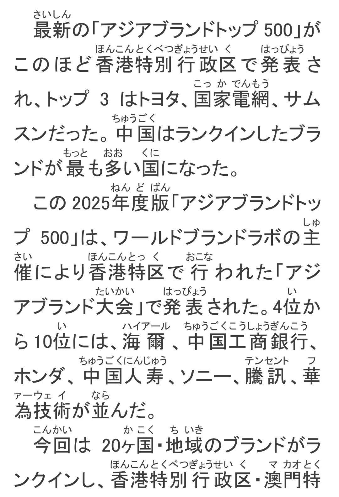 日文朗读 | 最新“亚洲品牌500强”:丰田、国家电网、三星居前三