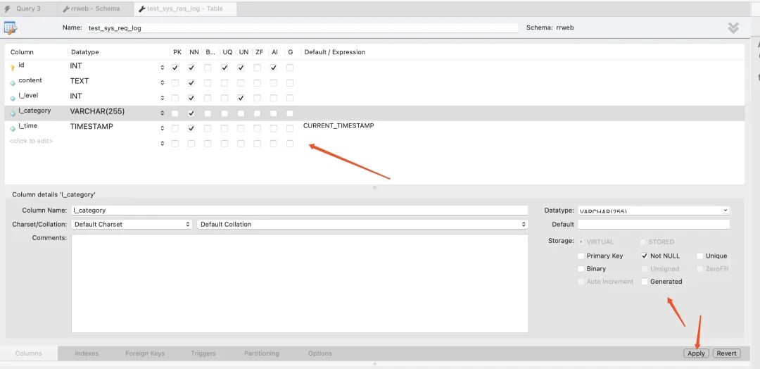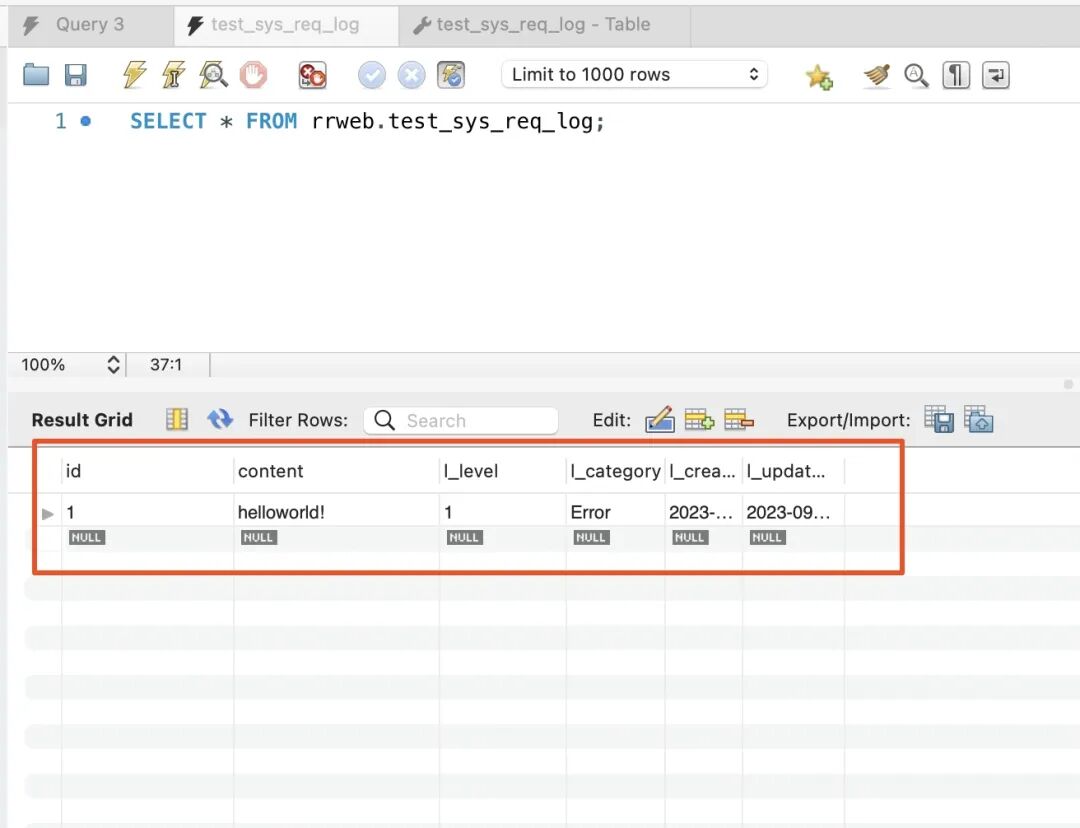 CREATE TABLE `rrweb`.`test_sys_req_log` (`id` INT UNSIGNED NOT NULL AUTO_INCREMENT,`content` TEXT NOT NULL,`l_level` INT UNSIGNED NOT NULL,`l_category` VARCHAR(255) NOT NULL,`l_created_at` TIMESTAMP NOT NULL DEFAULT CURRENT_TIMESTAMP,`l_updated_at` TIMESTAMP NOT NULL DEFAULT CURRENT_TIMESTAMP,PRIMARY KEY (`id`),UNIQUE INDEX `id_UNIQUE` (`id` ASC) VISIBLE,INDEX `table_index` (`l_level` ASC, `l_category` ASC, `l_time` ASC) VISIBLE);3.连接数据库