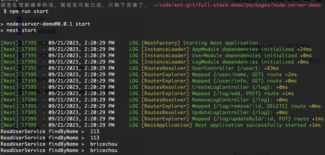# 进入文件夹目录cd full-stack-demo/packages# 安装脚手架npm i -g @nestjs/cli# 创建基础项目nest new node-server-demo# 进入项目cd new node-server-demo# 运行项目测试npm run start:dev