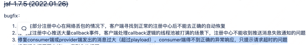 📌 经与JSF团队确认,consumer端或provider端发出的消息过大(超过playload)时consumer端得不到正确的异常响应只提示请求超时的问题,已经在1.7.5版本修复:需要provider端升级。升级后,如果consumer端发送的消息过大,provider会立即响应RpcException。