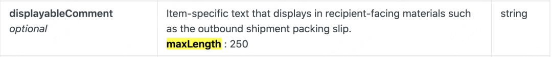 String displayableOrderComment; // maxLength: 1000String sellerSku; // maxLength: 50String giftMessage; // maxLength: 512String displayableComment; // maxLength: 250