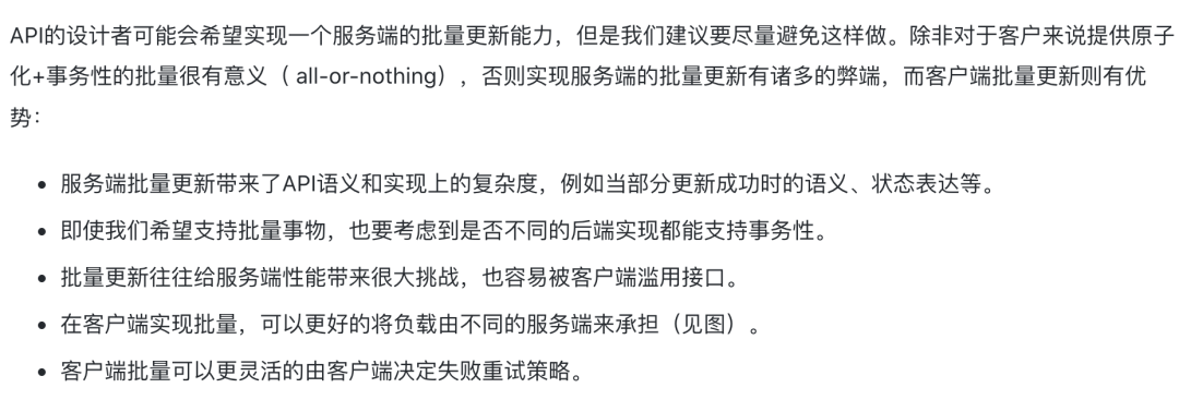 List size limit, property max length limit等,要在开放API的第一时间公布出去。如果开始不约束,后期加约束可能遭遇大的阻力和沟通成本。此外,遵循从严开始的规律,为自己争取主动:你把限制放开,没人找你岔,反之则阻力大。例如:order.items max size limit由100变成200,你可以放心地做;但由200变成100,你要征得现有使用者的全部确认。