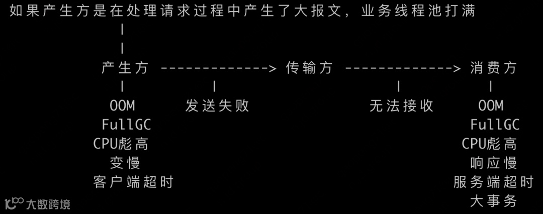 对于大报文的产生方,过大的报文在序列化时消耗更多内存和CPU,在传输时(JSF/MQ)可能超过中间件的大小限制导致传输失败;对于大报文的消费方,过大的报文在反序列化时会产生大对象,消耗更多的内存和CPU,容易触发FullGC甚至OOM,而在处理过程中要遍历的内容更多,造成响应变慢,如果涉及数据库操作容易产生大事务、慢SQL,这些容易触发超时,如果客户端有重试机制,会进一步加重大报文消费方负载,严重时导致服务集群整体不可用。
