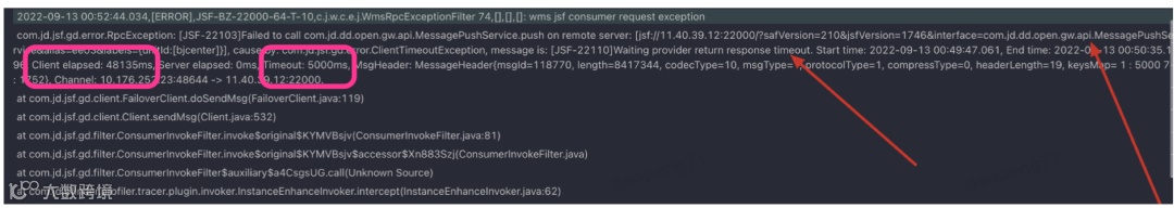 class JSFClientTransport {// consumer同步调用providerResponseMessage send(BaseMessage msg, int timeout) {MsgFuture<ResponseMessage> future = doSendAsyn(msg, timeout);return future.get(timeout, TimeUnit.MILLISECONDS);}MsgFuture doSendAsyn(final BaseMessage msg, int timeout) {final MsgFuture resultFuture = new MsgFuture(getChannel(), msg.getMsgHeader(), timeout);Protocol protocol = ProtocolFactory.getProtocol(msg.getProtocolType(), msg.getMsgHeader().getCodecType());byteBuf = protocol.encode(request, byteBuf); // 发送报文前的序列化RequestMessage request = (RequestMessage) msg;request.setMsg(byteBuf);channel.writeAndFlush(request, channel.voidPromise()); // socket.write,异步IOresultFuture.setSentTime(JSFContext.systemClock.now());}}class MsgFuture implements java.util.concurrent.Future {final long genTime = JSFContext.systemClock.now(); // new的时候就赋值了volatile long sentTime;// 抛出超时异常逻辑ClientTimeoutException clientTimeoutException() {Date now = new Date();String errorMsg = "[JSF-22110]Waiting provider return response timeout . Start time: " + DateUtils.dateToMillisStr(new Date(genTime))+ ", End time: " + DateUtils.dateToMillisStr(now)+ ", Client elapsed: " + (sentTime - genTime) // 它包括:序列化时间,由于异步IO因此不包括socket.write时间+ "ms, Server elapsed: " + (now.getTime() - sentTime);return new ClientTimeoutException(errorMsg);}}