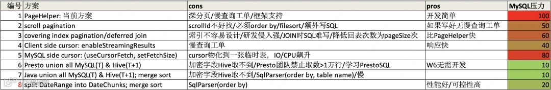 导出问题的本质,是大范围table scan,很难设计精细的复合索引。WMS6.0最初使用的是方案1,它会产生深分页limit offset问题:越往后的页面越慢,对数据库的压力越大。举例:要导出100万行记录,每页1万,那么到50万记录时,每次分页查询相当于数据库要扫描50万+行记录后抛弃绝大部分并返回1万行,这还要继续执行50次,此外分页组件还要额外执行count语句以计算总行数。如果每页是1千呢?因此,数据库的压力被放大了,可以简单理解为“全表扫描”了【50 + 100(count计算)=150】次,远不如不分页(不分页还要解决OOM问题)。目前,WMS6.0改用了方案8,根本上解决了数据库慢查询问题。思路是不再盲目静态分页,而是根据时间条件切分成多个SQL,分别查询,保证每个SQL返回数据量不大从而避免慢SQL。例如,某个仓要导出最近3个月的出库单数据,那么把这1个date range拆分(explode)成N个date range,分别执行: