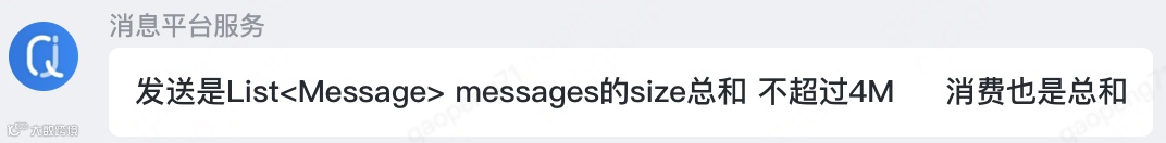 这里要注意,分批发送时,1)发送的超时(默认2s)作用于整批消息,而不是单个消息 2)消息大小限制(4MB)作用于整批消息之和,因此批包含的消息越多越可能失败。