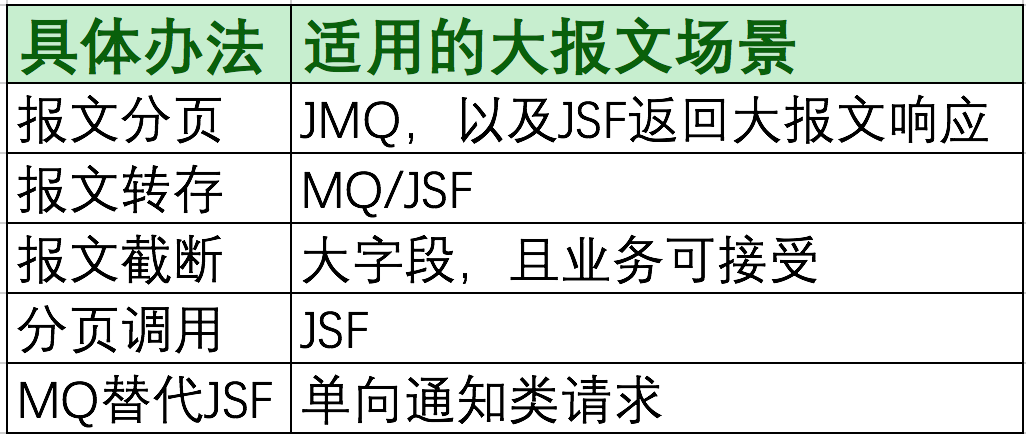有些大报文问题,可能暂时无法通过技术手段解决,例如,已经有商家接入的对外接口,开放时没有对List size限制,加限制后需要商家配合修改做客户端分页,而商家不配合。这时候,可以采用大促期降级,限流,加开关,加强监控,设计应急预案,为此接口提供独立的线程池来隔离正常请求等手段解决。