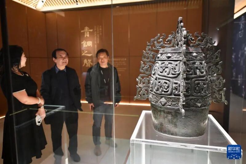 西安咸陽国際空港第5ターミナルビル内の博物館に展示されている中国の国家一級文化財・秦公鎛(2月20日撮影・邵瑞)。