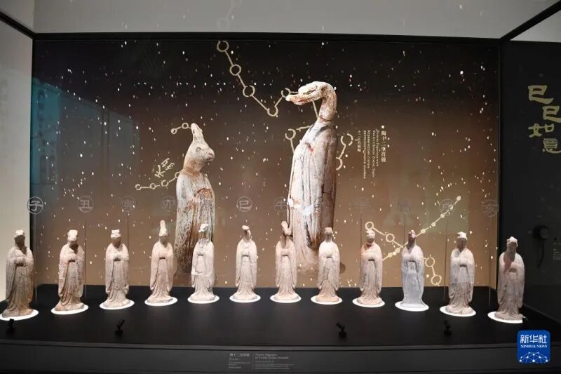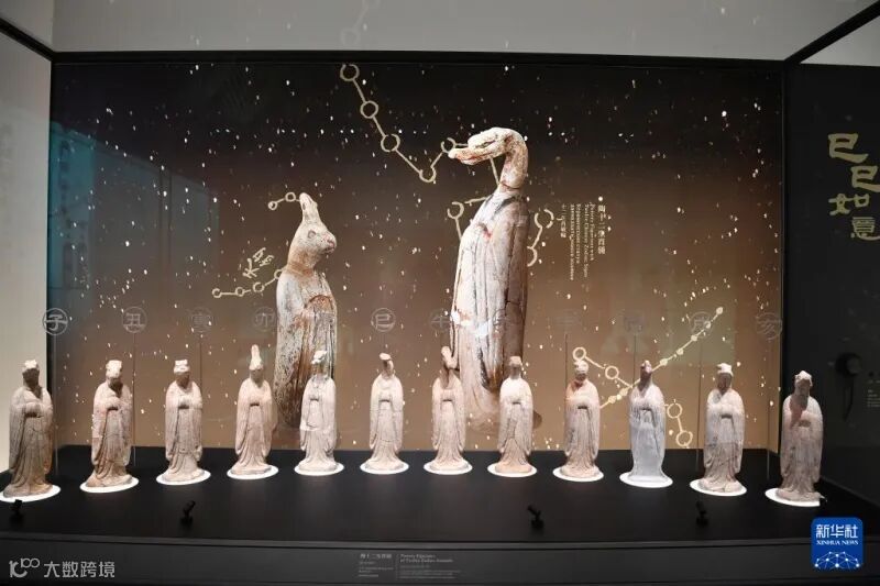 西安咸陽国際空港第5ターミナルビル内の博物館に展示されている唐代の文化財・陶十二生肖俑(2月20日撮影・邵瑞)。