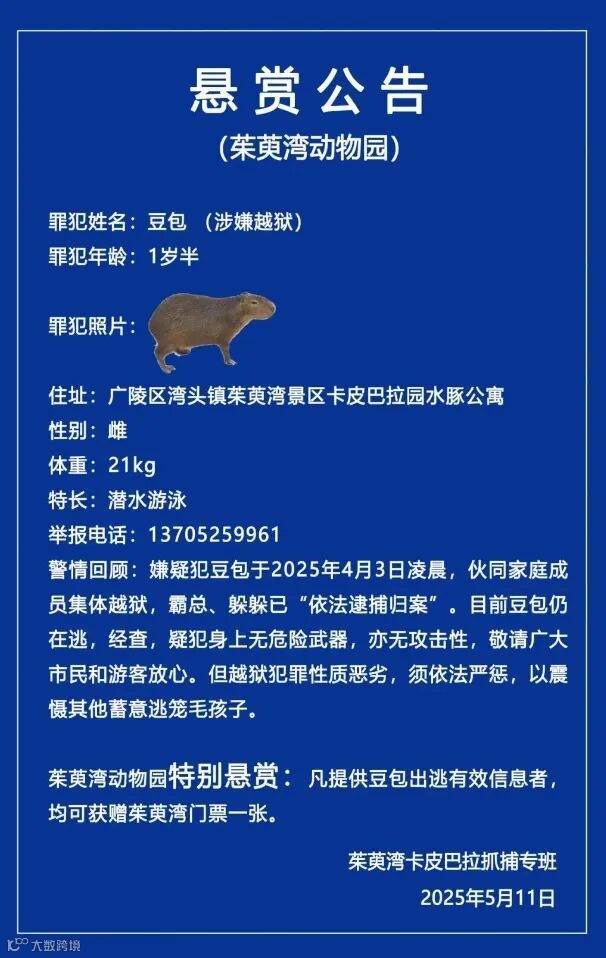 江蘇省揚州市の茱萸湾景勝区内にある動物園で飼育されているカピバラの「豆包」が今年4月3日に「脱走」。現在になっても見つかっていないため、同景勝地が今月11日に「尋ね人」ならぬ「尋ねカピバラ」の懸賞公告を出したところ、ネットで話題となっている。