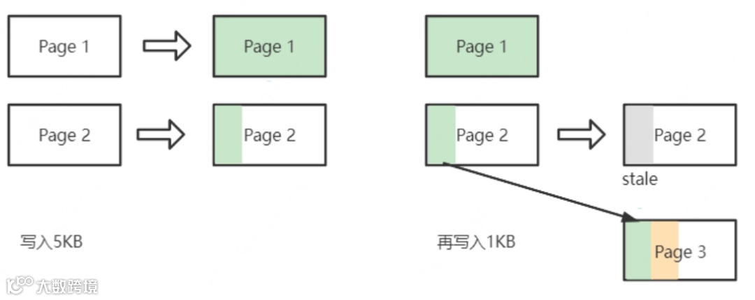 除了OS层的4K对齐至关重要以外,在文件写入过程中仍然需要关注4K对齐的问题。假设Page大小仍然为4KB,向一个空白文件写入5KB数据,此时需要2个Page来存储数据,Page 1写满了4KB,而Page2只写入1KB,当再次向文件顺序写入数据时,需要将Page2数据预先读出来,然后与新写入数据在内存中合并后再写入新的Page 3中,之前的Page 2则标记为 stale 等待被GC。这种带来的开销被称为写入放大WA(Write Amplification)。为了防止写入放大的情形出现,我们会提前将Page空间,用0填充写满。
