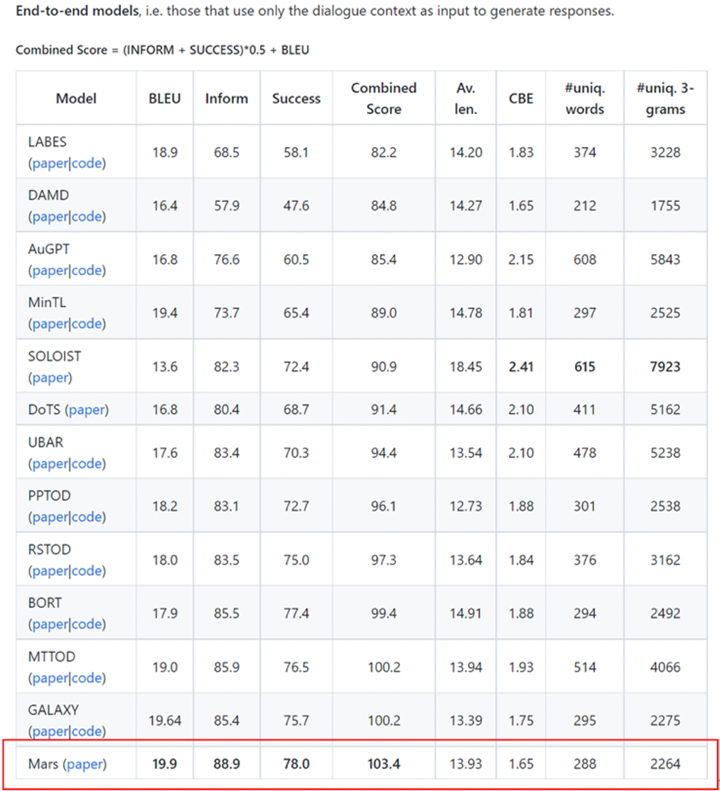 本次言犀团队提出的Mars模型,创新性地利用语义感知的对比学习方法来增强对话上下文表征与对话状态和对话策略之间的关系建模,从而使对话系统更好地完成任务。除了总评分,Mars模型在三个分项评价指标Inform, Success和BLEU也分别以89.9、78.0、19.9排名第一。