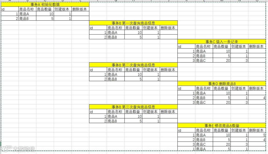 要让一个事务前后两次读取的数据保持一致,那么我们可以在修改数据的时候给它建立一个备份或者叫快照,后面再来读取这个快照就行了。不管事务执行多长时间,事务内部看到的数据是不受其它事务影响的,根据事务开始的时间不同,每个事务对同一张表,同一时刻看到的数据可能是不一样的。这种方案我们叫做多版本的并发控制 Multi Version Concurrency Control(MVCC)。