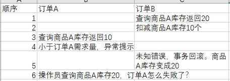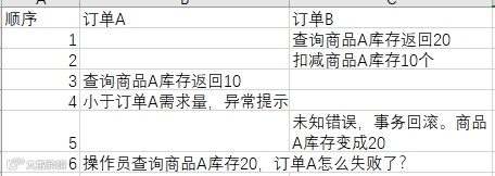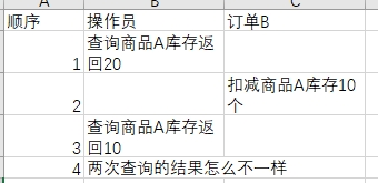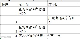 举例:订单A需要商品A20件,订单B需要商品A10件。仓库中有商品A库存是20件。订单B先查询,发现库存够,进行扣减。在扣减的过程中,订单A进行查询,发现库存只有10个不够订单数量,抛出异常。这时候订单B提交失败了。库存数量又变成20了。这时候,仓库人员去查库存,发现数量是20,可是订单A却说库存不足,这就让人很奇怪。