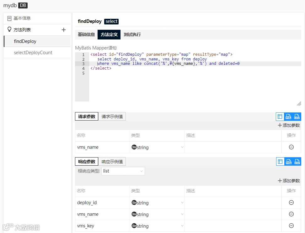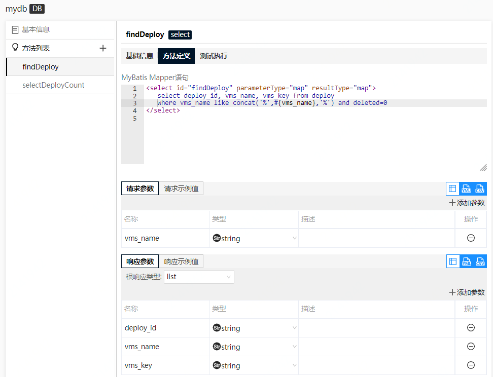 在DB/HTTP连接器中,可以自定义方法列表。图5展示了一个自定义DB连接器的例子,用户只要定义SQL、输入输出参数就能生成一个方法,在定义过程中,可以随时测试以验证定义是否正确。目前,需要用户使用MyBatis语法输入SQL,未来,星链会提供更为易用、更为智能的方式定义DB连接器。