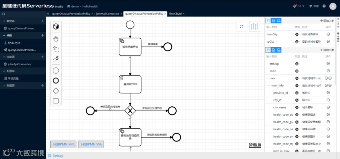 在线函数Debug:可以在Web上直接运行函数,查看运行结果,查看日志,诊断问题。对于BPMN函数,可以可视化地显示执行轨迹,可显示执行经过的每个节点的输入、输出或异常信息。支持对于远程调用设置Mock返回值,以便于联调。