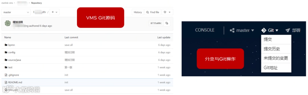 与大多数低代码平台是黑盒子不同, 星链开发的VMS保存在Git代码仓库上,源码是完全可见的,用户可以克隆到本地,使用本地IDE开发、调试和运行单测,在本地开发中,可以引入第三方包(如Java语言的jar包,JavaScript语言的npm包等),并在代码函数中使用这些包,而且,本地提交后,在Cloud Web IDE上也完全兼容可见。在Cloud Web IDE上也支持Git操作,包括切换分支、提交、查看提交历史、对比变更等,如图9所示。