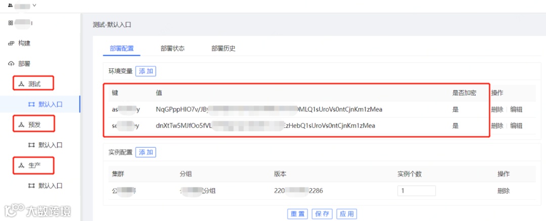 在星链中开发、测试、部署,不需要关注服务器细节,在部署时,只需要说明部署的集群分组、需要部署的实例个数、部署的版本即可,可以在一次部署中声明多个集群分组,这些分组可以位于不同的机房、可用区,系统自动调度。声明式部署可以方便地支持灰度发布、扩缩容,只需要修改版本声明、实例个数即可,系统自动调整。支持部署环境隔离,区分测试、预发、生产不同环境。复用计算引擎资源,没有冷启动,热加载,部署快。支持部署态加密环境变量,针对敏感变量加密存储,确保安全。示例部署配置如图11所示。