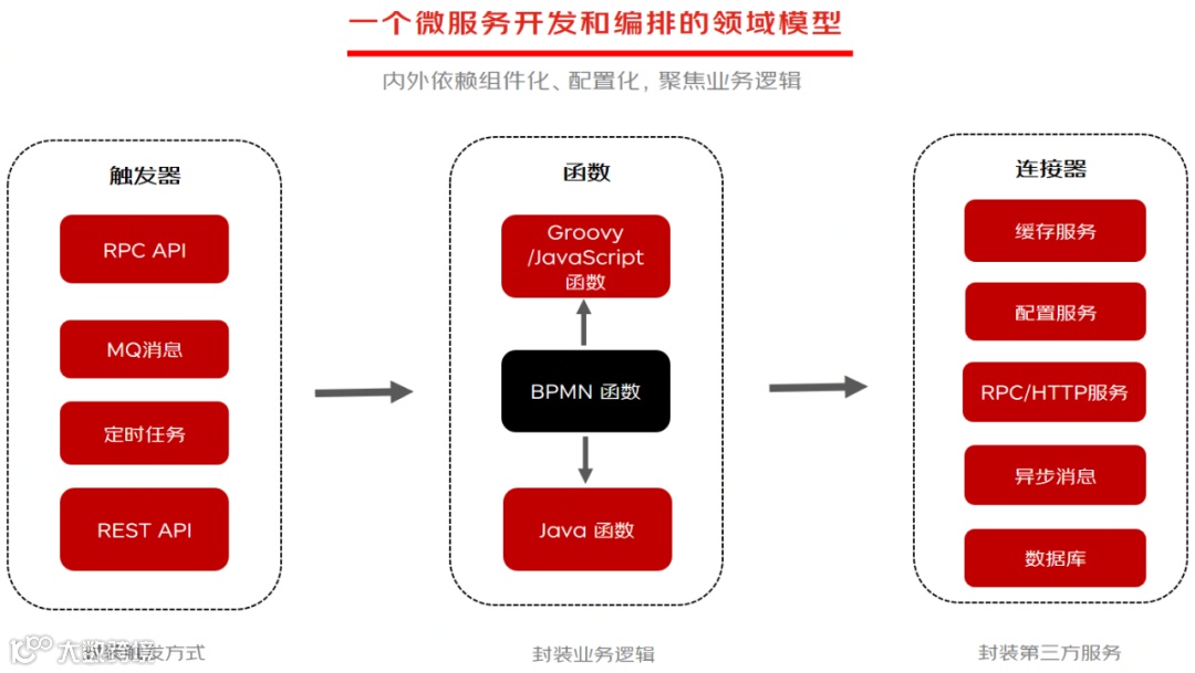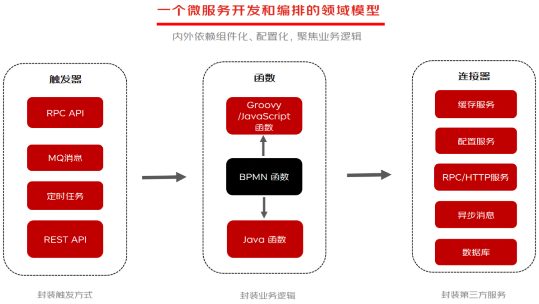 这个模型的基本思路是让微服务应用的内外依赖组件化、配置化,使开发人员可以聚焦业务逻辑,包含三个核心概念:函数、连接器和触发器。函数封装业务逻辑,由标准的输入/输出以及函数体组成,支持代码函数和BPMN函数。代码函数支持Java、Groovy、JavaScript三种语言,未来会支持更多语言。BPMN函数利用BPMN标准可视化地编排业务逻辑,可以引用代码函数,也可以引用其他BPMN函数,构建复杂业务流程。连接器封装第三方服务,包括RPC服务、HTTP服务、异步消息、缓存服务、配置服务、数据库等。触发器封装函数对外提供服务的方式,支持RPC、HTTP REST API、定时任务和MQ消息触发,每个触发器关联一个函数。星链会不断拓展支持新的触发器和连接器类型,未来也会开放SDK给用户自定义星链不支持的类型。