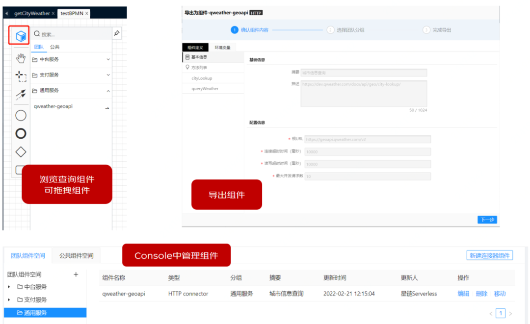 星链提供了独特的业务组件库功能,除了提供系统公共组件,星链还支持自定义团队组件。公共组件由系统维护,每个用户都可以使用。系统将不断完善公共组件库建设,在私有化部署中,客户可以自定义系统组件。团队组件由团队自己维护,对其他团队不可见。用户在VMS内自定义的连接器组件(如DB/HTTP连接器)可以导出为团队组件。用户可以在星链控制台中维护团队组件,包括组件分组等。在BPMN编排中,用户可以浏览、查询团队或公共组件,并直接拖拽到编排面板中。如图8所示。