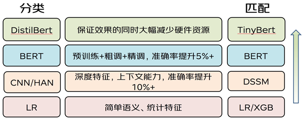 针对非点击的用户输入问题,系统需要通过意图识别算法理解用户意图。如目前行业主流技术,文本分类、文本匹配一直是识别高频意图/问法的基础模式,而这些标准NLP任务一直有相对成熟的算法。如图3所示,京东智能客服言犀中的分类、匹配算法也紧跟领域前沿,经历了从传统机器学习+人工特征抽取模式,到深度模型,再到基于大规模预训练模型的阶段。整个发展过程,识别效果在持续提升,但模型复杂度也在逐步增加,而且模型对硬件资源的要求也相应地越来越高。因此,我们通过领域预训练模型结合蒸馏、模型压缩等手段,在保持识别效果的前提下大幅降低对硬件资源的要求,同时提升模型的运行速度。