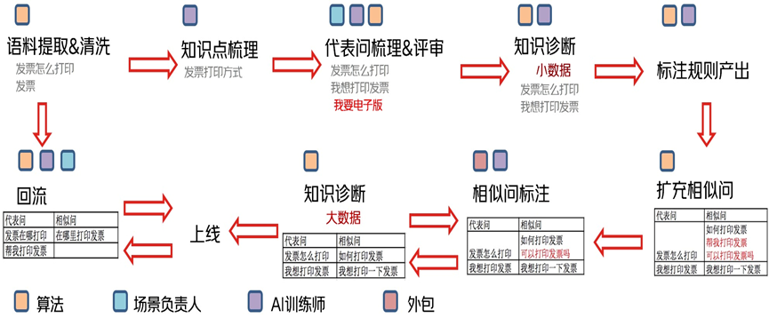 整套方案中,参与人员包括算法、场景负责人、AI训练师、外包标注人员四中角色。其中算法人员熟悉各类识别算法,并提供工具支撑,同时基于对算法的了解从数据维度判断如何划分意图体系。场景负责人拥有丰富的业务经验,对每一类业务有什么问题,应该如何应答提供专业意见。AI训练师作为算法和场景负责人之间的桥梁,同时对算法和业务有一定了解,并将业务知识按照算法规则梳理出来与各方进行沟通调整。外包同学基于AI训练师梳理的明确规则,进行数据标注。