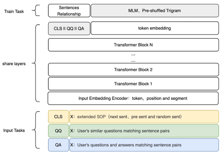 最后,训练方式如图8所示。我们提出了提示性多任务并发训练方式,采用 不同的first token标签,引导不同任务预训练。具体的,[CLS] token预训练学习SOP扩展任务、[QQ] token预训练学习相似度匹配相关任务、[QA] token预训练学习问答相关任务。基于以上方法产出的预训练模型,在京东智能客服言犀的多个业务线,以及各类任务上对比多种开源模型,均取得了最优效果。