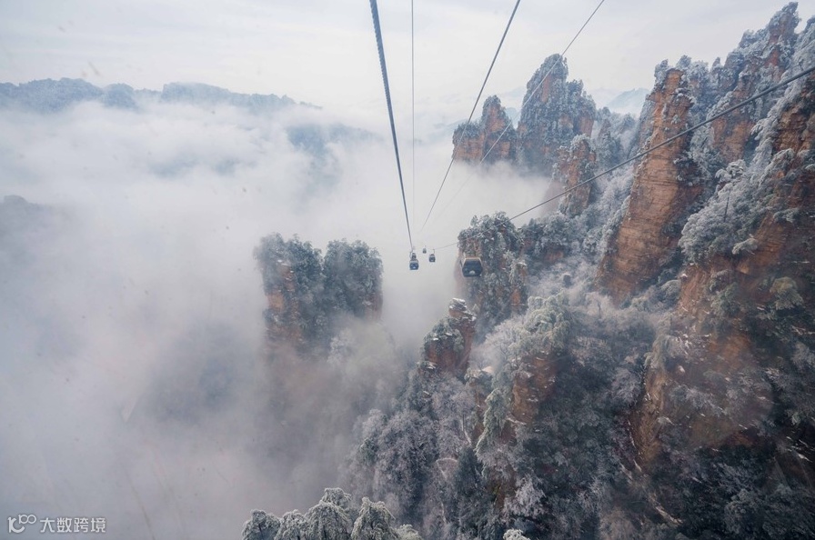 武陵源には以前も行ったことがあったのですが、雪景色を見たくて冬に再訪。ただ園内に雪が全然なく、ガッカリしながら天子山ロープウェイに乗り込みました。そんなモヤモヤした気持ちを抱きながら霞んだ雲の中を進み、急に視界が晴れて見えたのがこの景色でした。