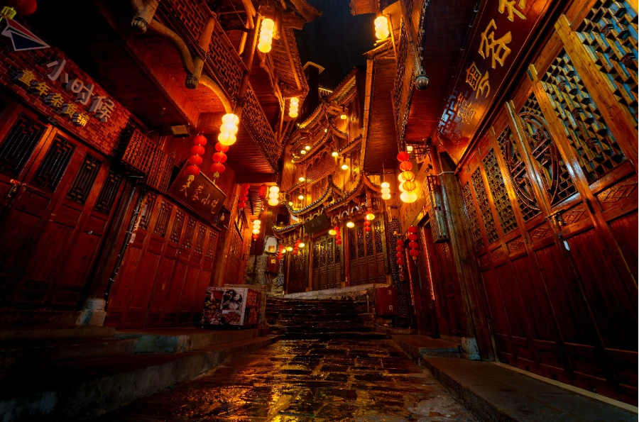 芙蓉鎮(湖南省):小さな集落の中心を流れる大きな滝を囲むように古い町並みが作られていて美しい。特に、上品なライトアップの中で楽しむ夜の散歩は最高。