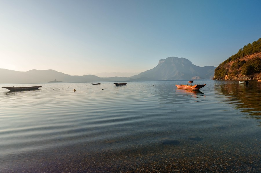 瀘沽湖(雲南省):圧倒的に透明な水が周りの景色を反射する鏡面世界のように美しい風景。現地の少数民族伝統の小舟で湖を遊覧すると一層美しい。
