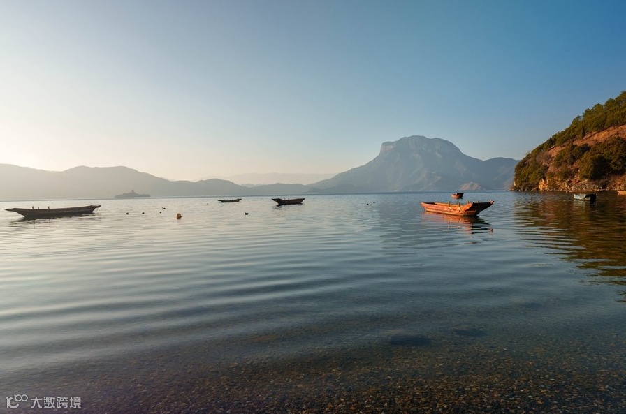 瀘沽湖の夕暮れ(撮影·宮﨑一騎)。