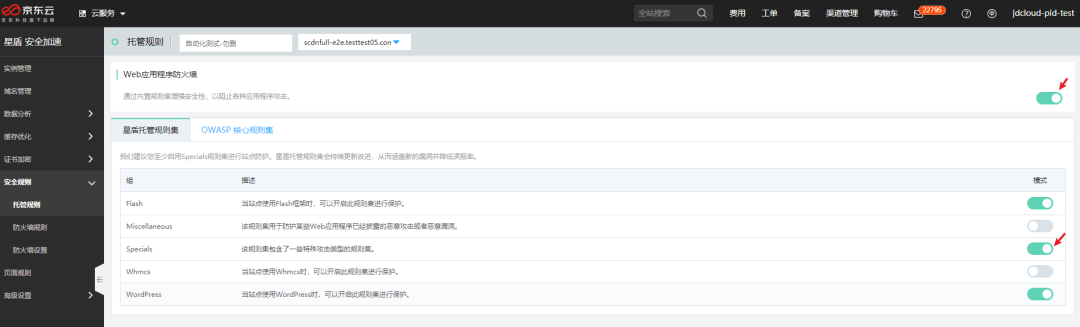这些针对漏洞防护的规则均已经下发到星盾安全加速全国分布式节点。规则位于星盾的托管规则-Specials规则中,使用星盾安全加速产品的用户,访问京东云星盾安全加速控制台,仅需开启默认规则防护,开启Specials规则开关,就可以轻松为站点增加安全性,全面升级针对Log4j2漏洞的防护。同时,星盾近“缘”防护的策略,使得防护效果更高效。