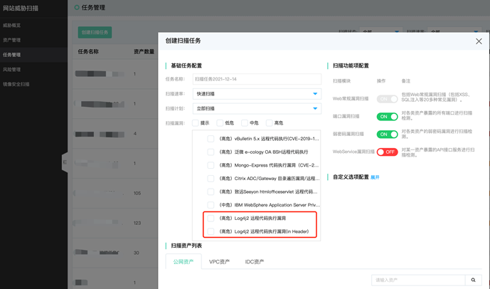 具体操作:在网站威胁扫描控制台左边栏任务管理,创建扫描任务,选择远程代码执行下面的Log4j2漏洞检测选项后,选择资产,点击确定。
