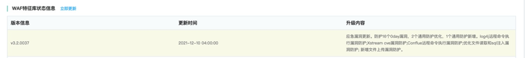 面对核弹级别的漏洞,Web应用防火墙作为流量防护第一道防线,目前已更新对Apache Log4j 远程命令执行漏洞防护的规则: