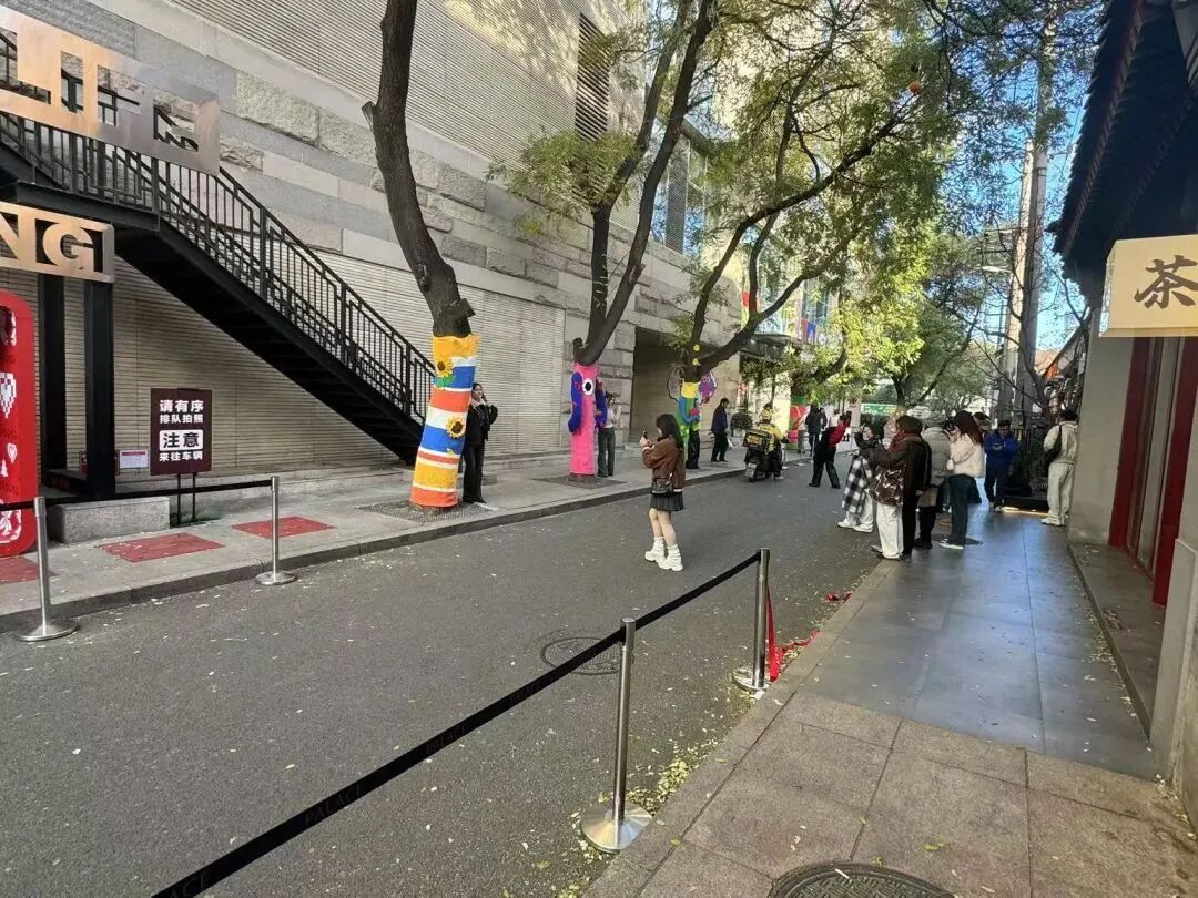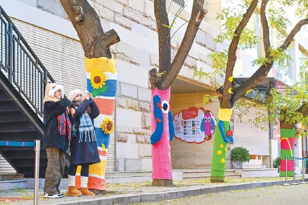 北京市東城区の紅星胡同に植わっている5本の木に最近、カラフルな「セーター」が着せられ、多くの市民が連日押し寄せ、「かわいい!」と評判になっている。