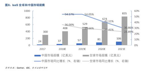 目前中国的云计算发展已进入快速增长阶段。私有云市场在过去五年保持着年均20%的增长态势。根据Gartner预计,2020年全球私有云市占率将达36%。IDC预测,2023年中国私有云IT基础架构支出将成为全球第一大市场,私有云市场具有较大发展潜力。中国的IaaS(基础设施即服务)呈现起步晚、体量小的特征, 但在近几年呈现爆发式的增长,在新基建的浪潮下,政府、金融、制造业等传统企业上云需求进一步扩大,未来将进一步释放动能,预计年均增长达到40%左右,远高于世界的平均水平。