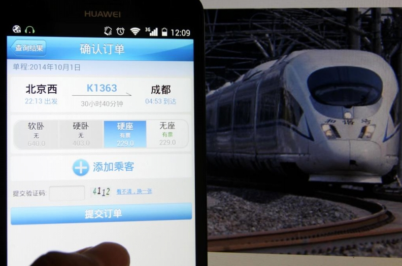 2014年9月12日、スマホの12306アプリを使って国慶節(建国記念日、10月1日)にともなう連休初日の鉄道切符を予約購入する北京市民。
