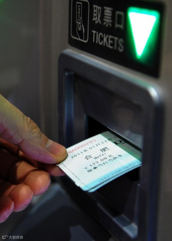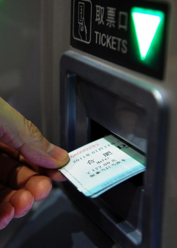 2011年1月17日、合肥駅で自動発券機で切符を発券して受け取る乗客。(撮影・李健)