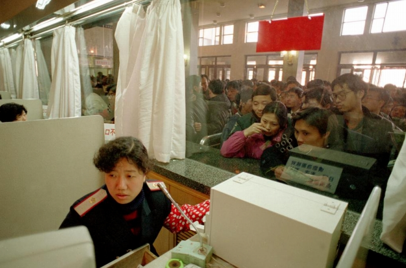 1997年1月18日、北京駅の切符窓口で乗客のためにコンピュータで切符を確認している販売係。(撮影・陳建力)