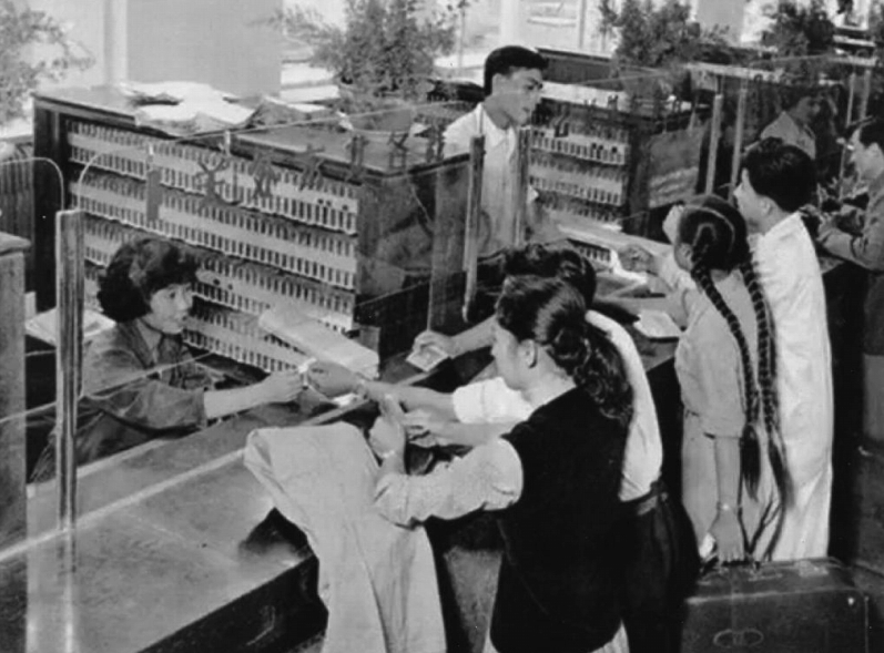 1950年代、北京駅の切符窓口で切符を買う人々。(北京駅提供)