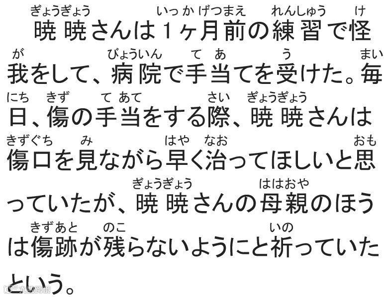 練習で怪我し、まだあごにかさぶたが残っている孫暁暁さん。撮影・邱宇哲