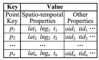 针对海量数据,目前采用的主流方法是分布式非关系型数据库,例如HBase。然而,原生的HBase是一个键值(key-value)数据库,只能根据一维的键值快速找到记录,没有有效的时空索引(时空数据可以看成是3维的:经度、纬度、时间),无法高效实现时空范围查询等查询分析。此外,HBase本身没有对时空数据进行优化存储,因此占用的磁盘空间非常大。以轨迹数据为例,传统的存储方式如图5所示,每个GPS点占用一行数据,造成数据条目数与GPS点的数目相同,导致存储空间开销很大。