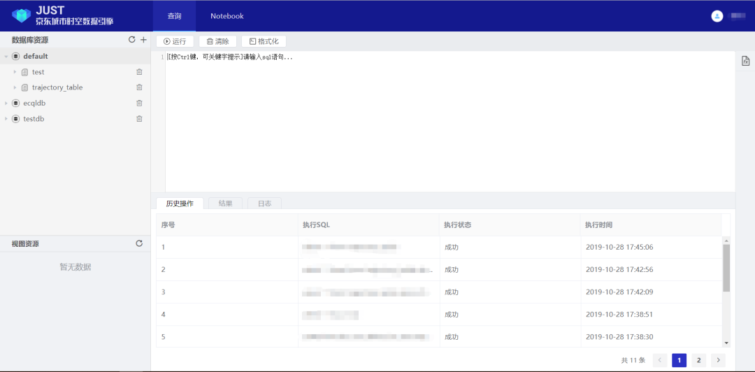 相较于业内同类型的其他时空数据管理平台,JUST提供了丰富的时空数据模型,能够全面覆盖所有时空数据;同时设计了高效的索引存储管理方法,为每一种数据类型封装了丰富的开箱即用的处理分析函数;此外,JUST还提供了完整的SQL引擎,所有的操作都可以简单的使用SQL语句实现;为AI算法工程师准备了完备的Notebook,方便一站式地模型构建。