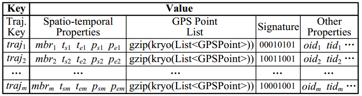 除此之外,JUST还对6种时空数据类型的每种数据类型设计了最佳的索引存储方式以及数据分析方法。还是以轨迹数据为例,我们预置了多种开箱即用的轨迹处理方法,包括轨迹异常值过滤、轨迹分段、轨迹地图匹配、轨迹插值等;对于每条分段后的轨迹,我们将这条轨迹的GPS点存储在同一条数据记录中,并采用GZip压缩方式,这样能够大大减少数据的条目数和占用空间,如图7所示。通过我们的实验,采用JUST的轨迹存储方法与原来传统的非关系型数据库的存储方法相比,磁盘空间缩小至1/8。更小的存储空间不仅节约磁盘空间,在有限的网络带宽下还加速了查询效率。好比一扇不大的门,对于胖子们来说,一次只能一个人穿过,而对于瘦子来说,可以允许两个人同时经过。